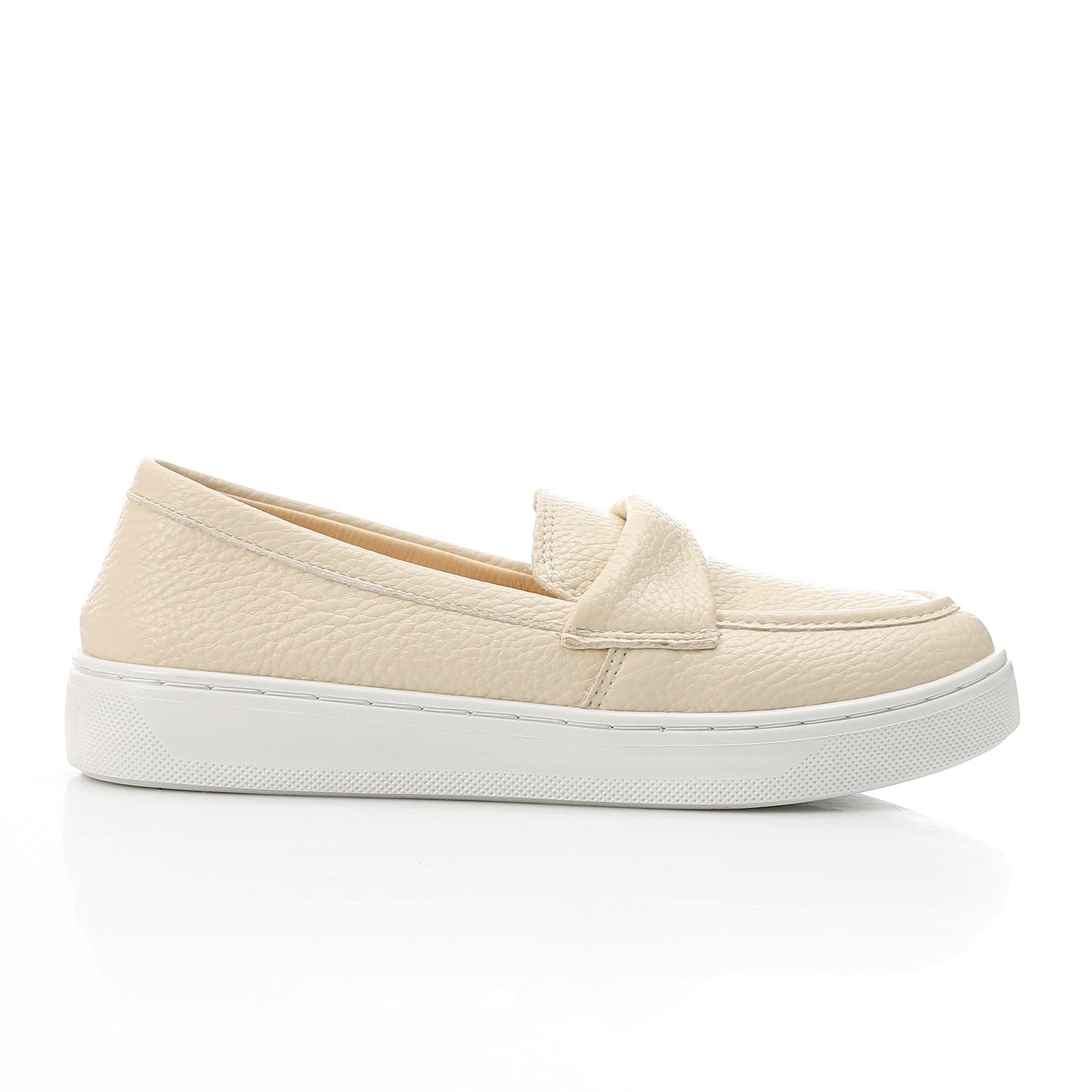 Silhouette: The shoe has the classic, low-profile upper of a loafer or moccasin, but it is paired with a thicker, flat white cupsole (similar to a sneaker), which gives it a contemporary and casual look.