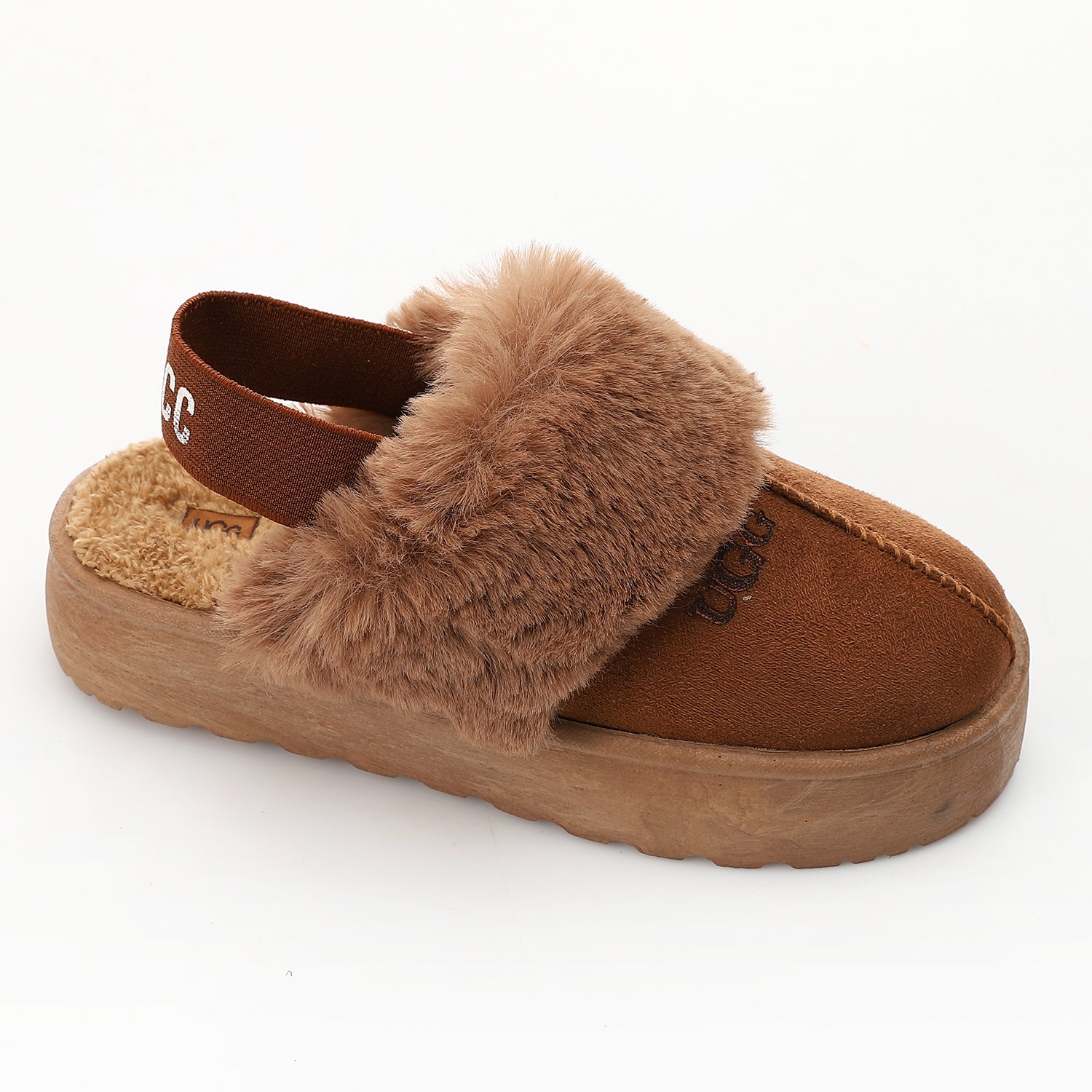 Collar/Lining: The main decorative feature is a wide band of long, plush faux fur across the top of the foot. The footbed and the back inner heel area are lined with a shorter, soft faux-shearling or fleece material for warmth and comfort.