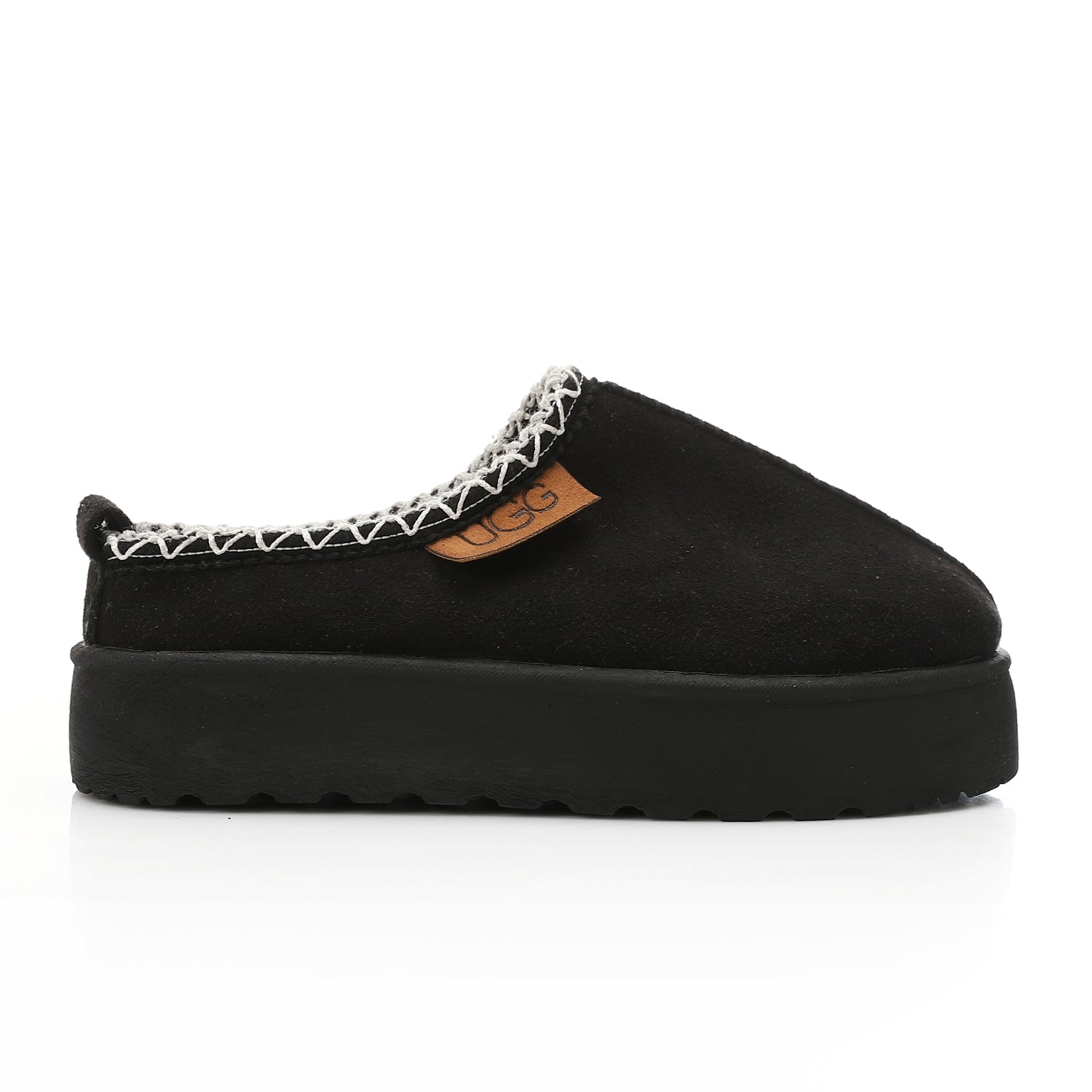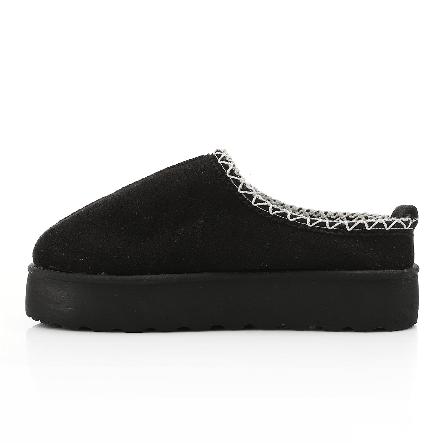 Collar Detail: The edge of the collar features decorative, contrast whipstitching or crochet trim, which highlights the opening of the shoe and gives it a handcrafted, stylish finish. A small pull-tab is visible at the heel to assist with slipping the shoe on.